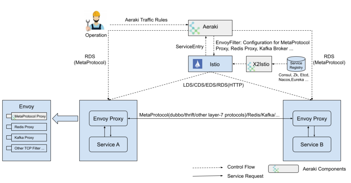 对于大多数请求/响应风格的协议,流量操作的代码非常相似。因此,为了避免在不同的 Envoy 过滤器中重复这些功能,Aeraki 框架在一个地方(MetaProtocol 代理过滤器)实现了第 7 层协议代理的大部分常见功能。