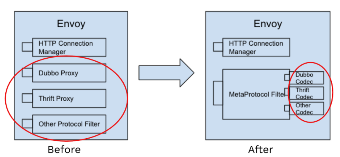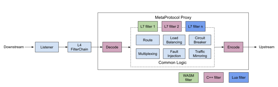 让我们看看 MetaProtocol 是如何工作的。在引入 MetaProtocol 之前,如果我们想为特定协议代理流量,我们需要编写一个理解该协议的 Envoy 过滤器并添加代码来操作流量,包括路由、头部修改、故障注入、流量镜像等。