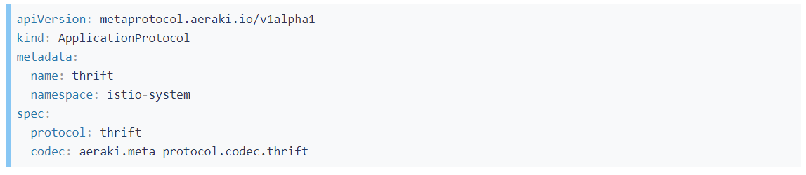与 Istio 类似,协议由服务端口前缀标识。请使用以下模式命名服务端口:tcp-metaprotocol-{应用程序协议}-xxx。例如,Thrift 服务端口应命名为 tcp-metaprotocol-thrift。
