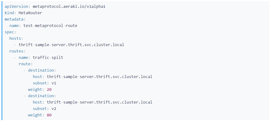 MetaRouter您可以通过CRD更改路线。例如:将 20% 的请求发送到 v1,将 80% 的请求发送到 v2: