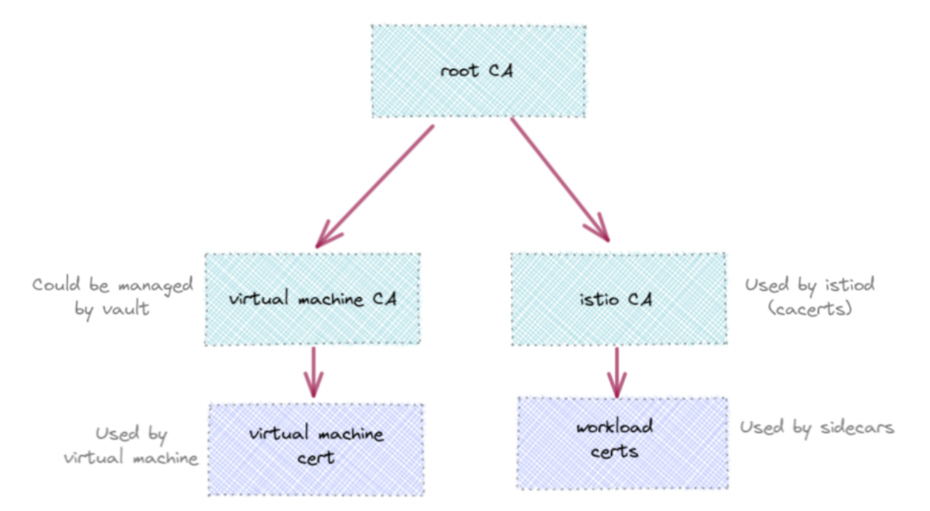 组织证书的最简单方法是创建共享根 CA。然后,可以颁发两个中间 CA 证书并用于创建 Istio 工作负载和虚拟机证书。虚拟机 CA 可以很容易地由 Hashicorp 的 Vault 等第三方证书管理系统管理。