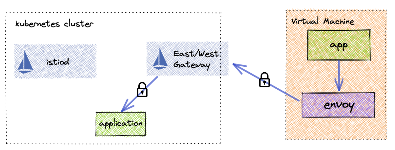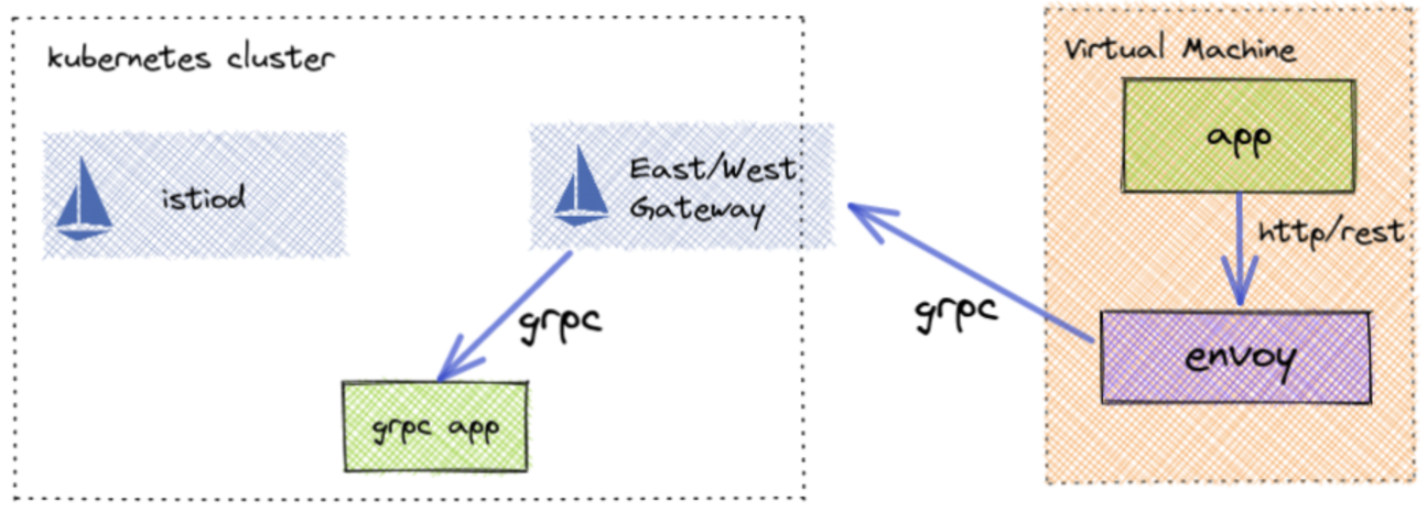 下面是一个安装 istiod 和上面显示的东西向网关的 Istio 示例。 PILOT_SKIP_VALIDATE_TRUST_DOMAIN 启用,以便虚拟机可以拥有自己的 SPIFFE ID 格式。
