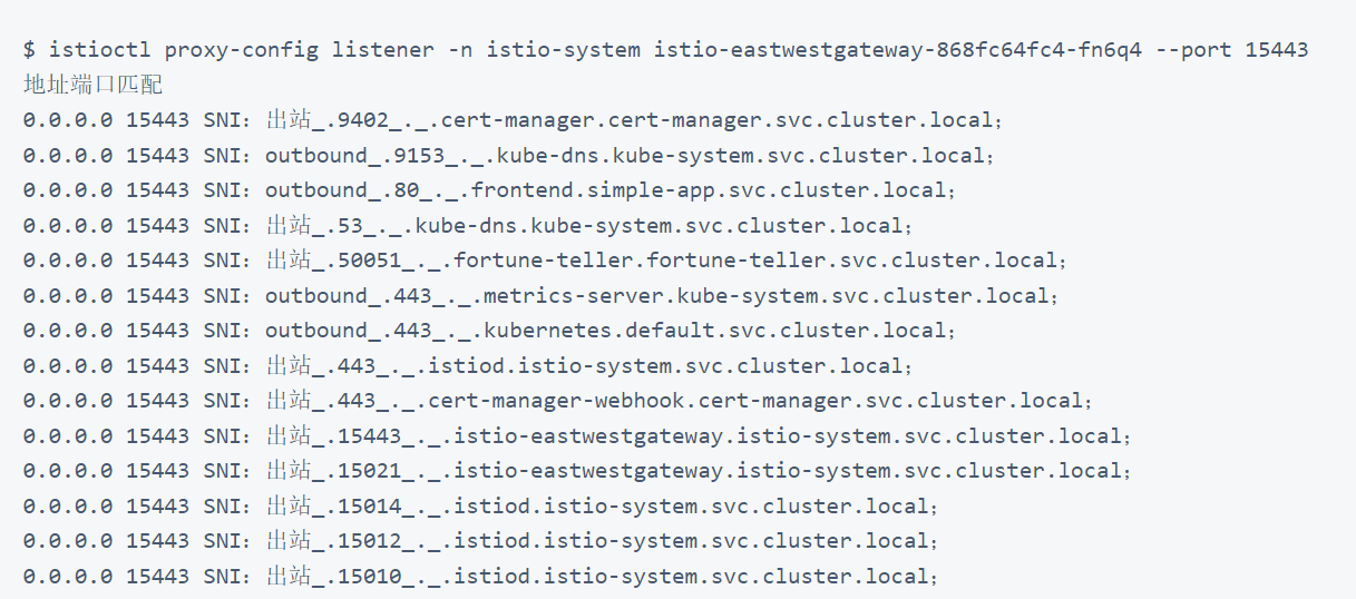 该字段是东西向网关用来将流量转发到正确的网状应用程序的字段。它需要匹配 istioctl proxy-config listener 上面命令中显示的网格应用程序的侦听器。