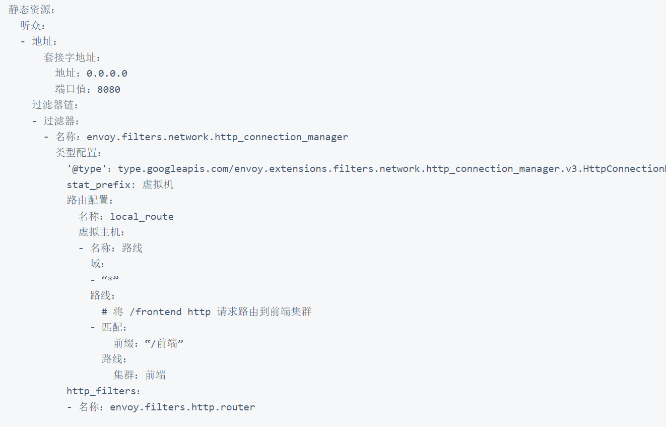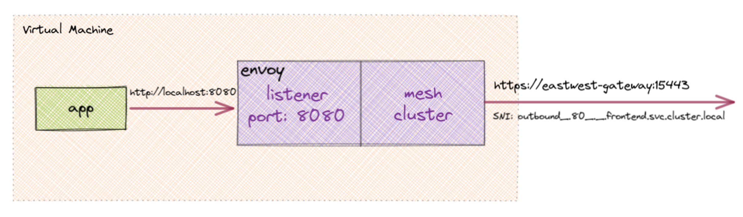 由于我们不会将虚拟机中的 envoy 连接到外部 xDS 服务器,因此我们需要手动提供其配置。我们需要为虚拟机应用程序创建一个入站侦听器以进行通信。
