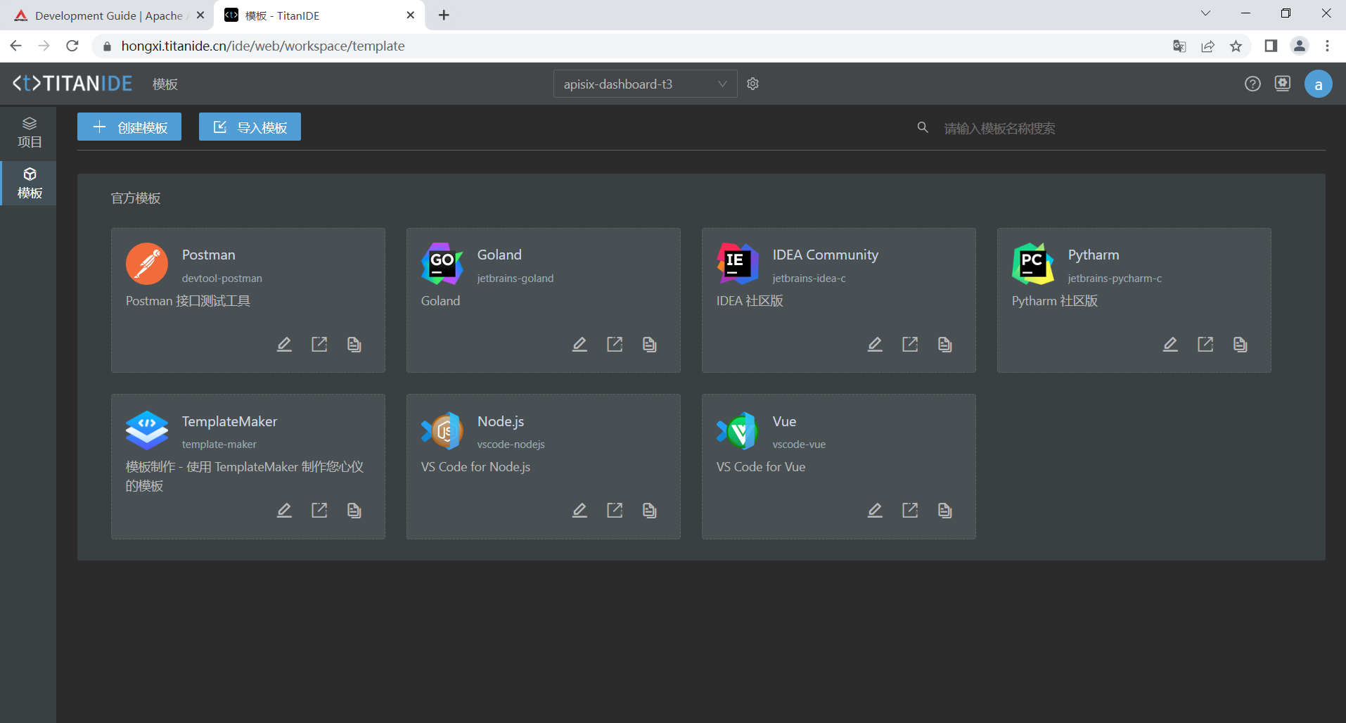 发现他由Golang 的后端服务和Node.js的前端所构成,我就到TitanIDE的模板库里,找到了GoLand 开发模板和Node.js 开发模板,顺带手的也下载了Postman模板,也是几分钟就在TitanIDE里安装好了。