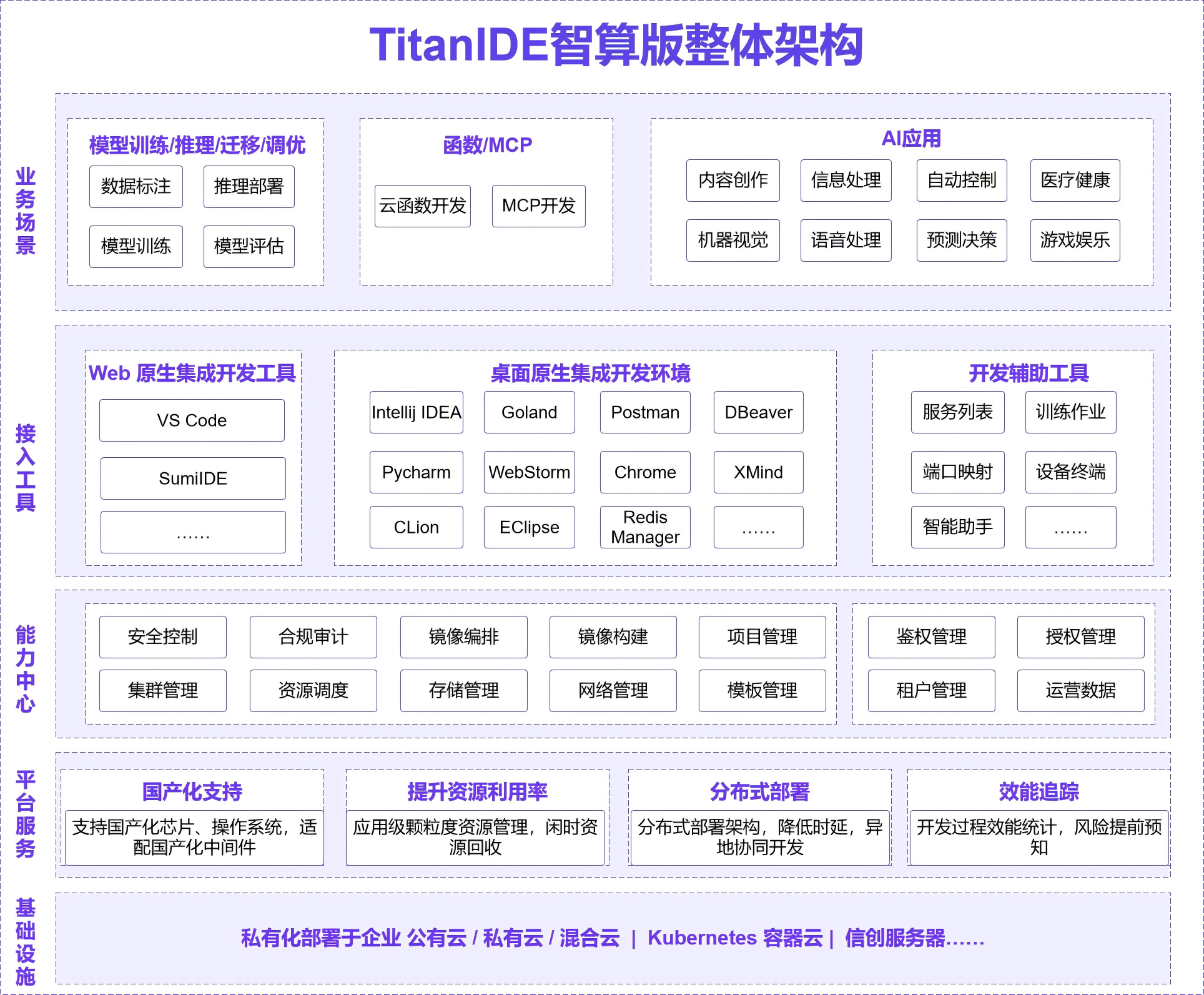 TitanIDE 全面满足企业数字资产研发 “智能提效、安全管控、效益透明” 建设需求。