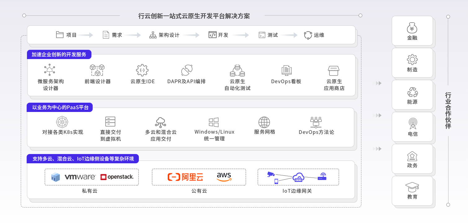 行云创新一站式云原生开发平台产品Cloud OS,包含云原生应用架构设计、在线协同编码开发、基于云原生的API管理和接口测试、多云交付和应用调度、灰度发布、流水线、应用运维、服务治理、多容器集群管理、云边一体化业务交付等能力。目标是提升应用架构敏捷度,大大加快软件开发迭代速度,提高IT资源的弹性和利用率,助力企业客户加速实现业务价值。