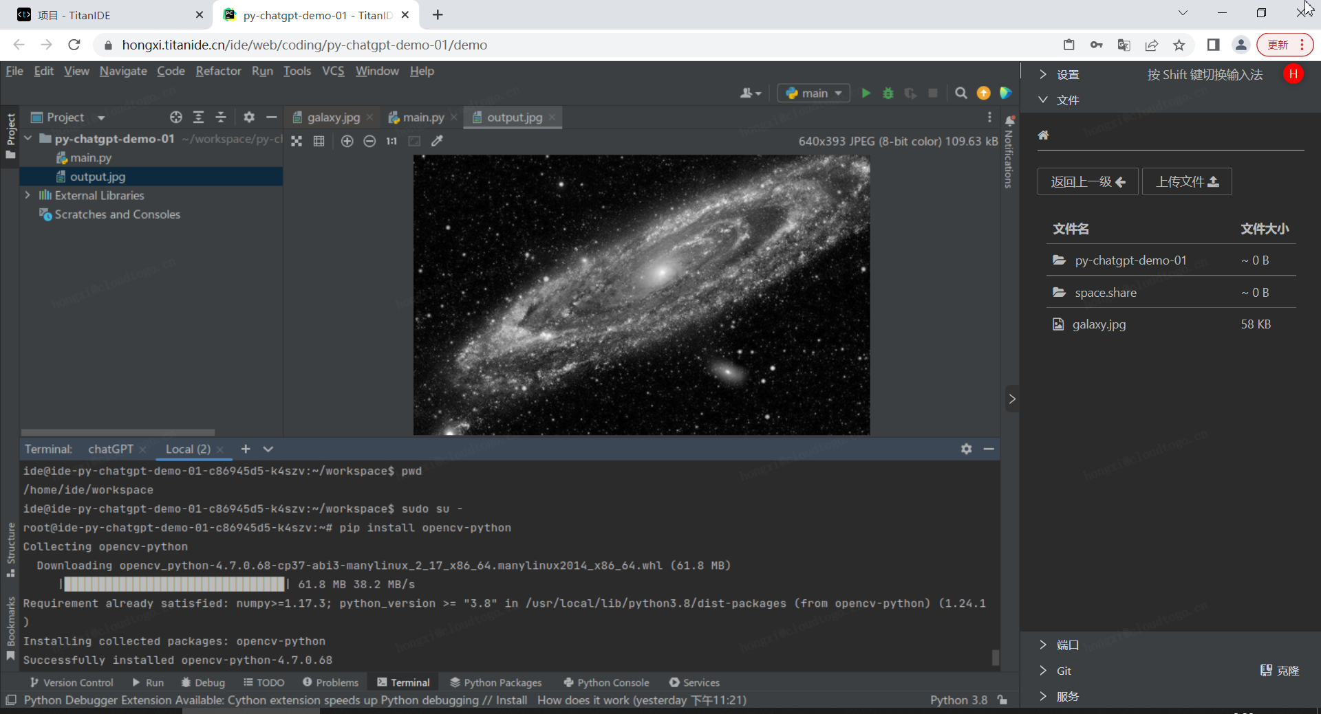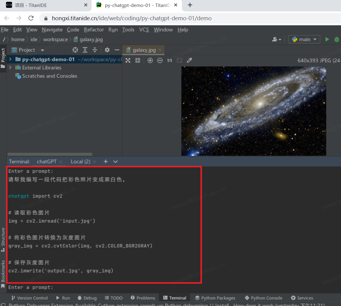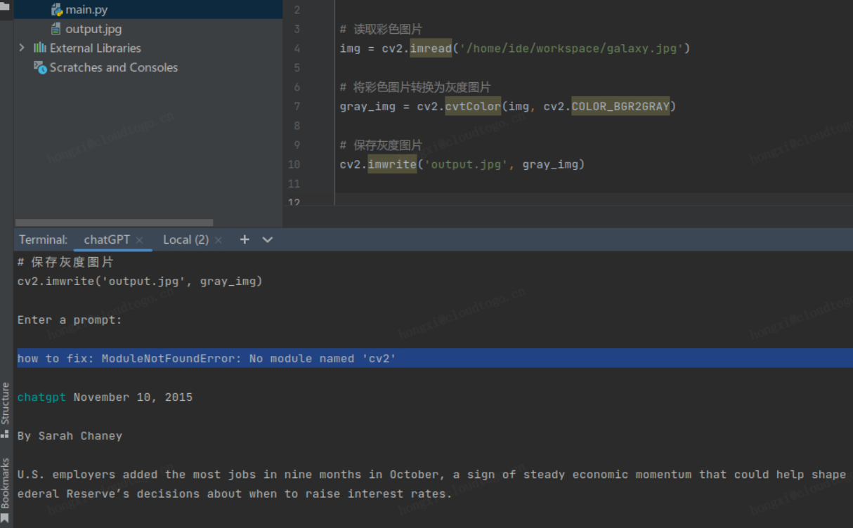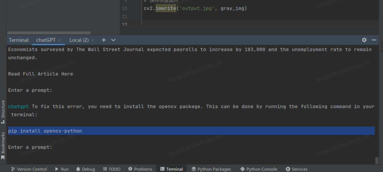 把代码copy到main.py中,改好图片路径,管他三七二十一跑一把,提示 cv2 模块找不着,再问问 chatGPT 怎么处理:
