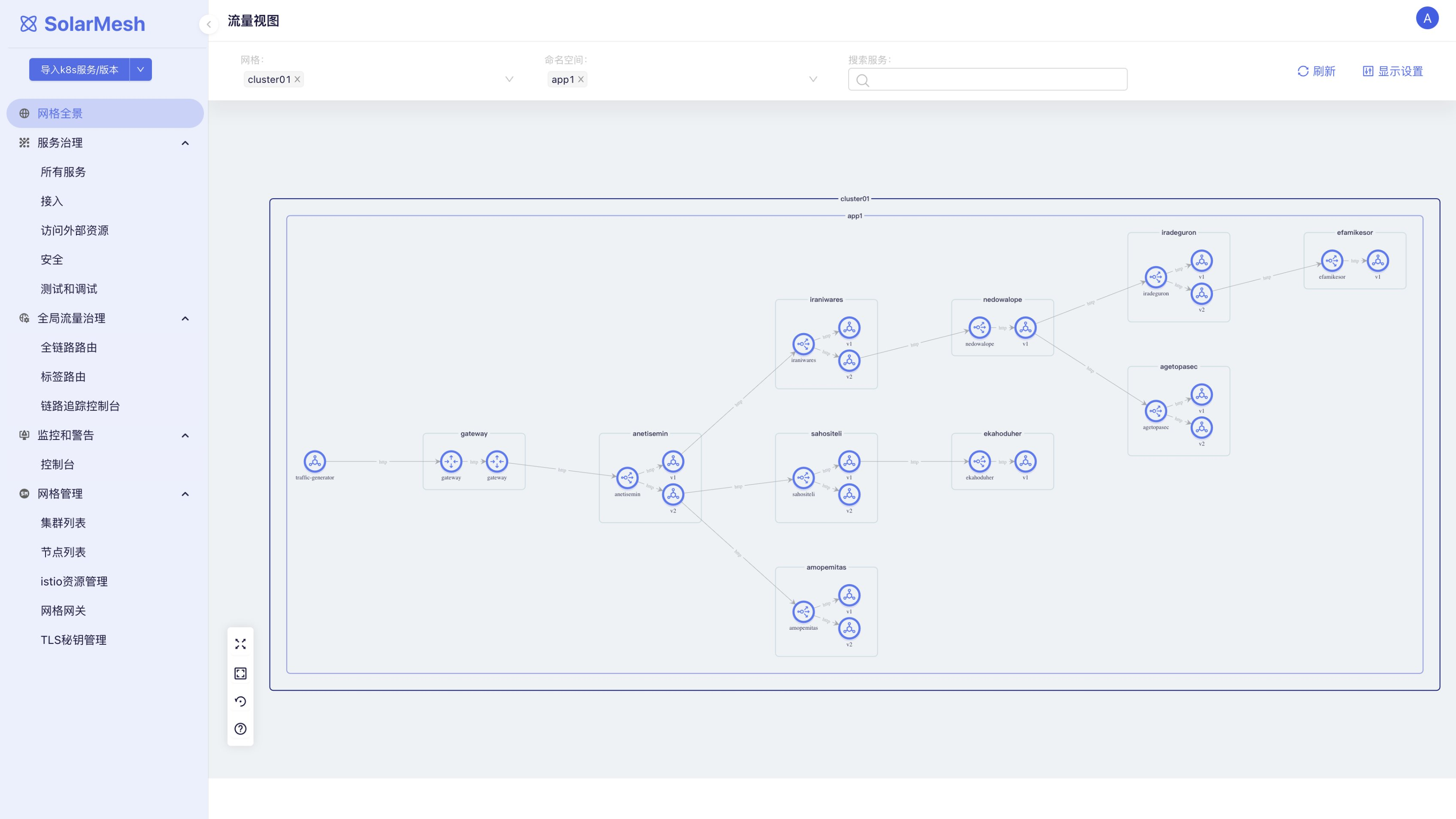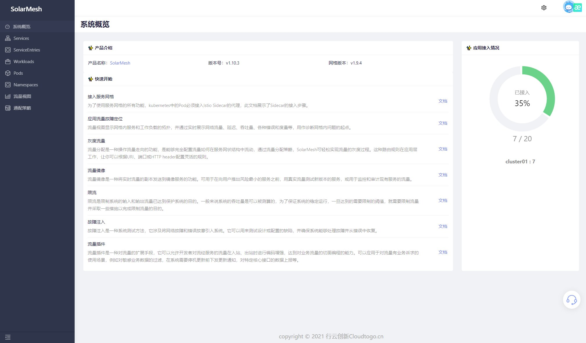 SolarMesh是行云创新推出的流量治理平台,它基于Istio,为部署在K8s集群上的应用提供全面的流量治理能力。