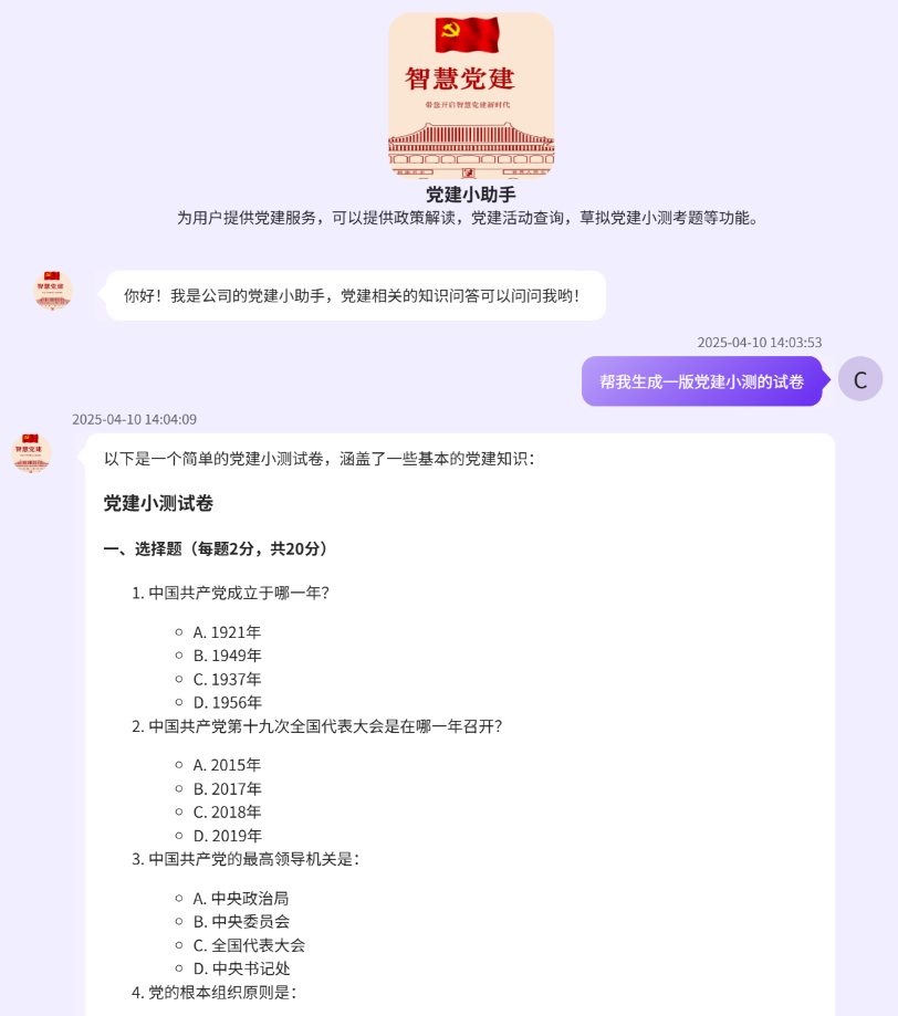 · 建党小助理:党建知识图谱,自动生成随机题库并智能判卷,政策实时更新(例如新发布的《中国共产党纪律处分条例》修订条款实时标注并推送至相关部门)。