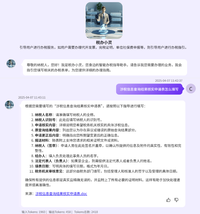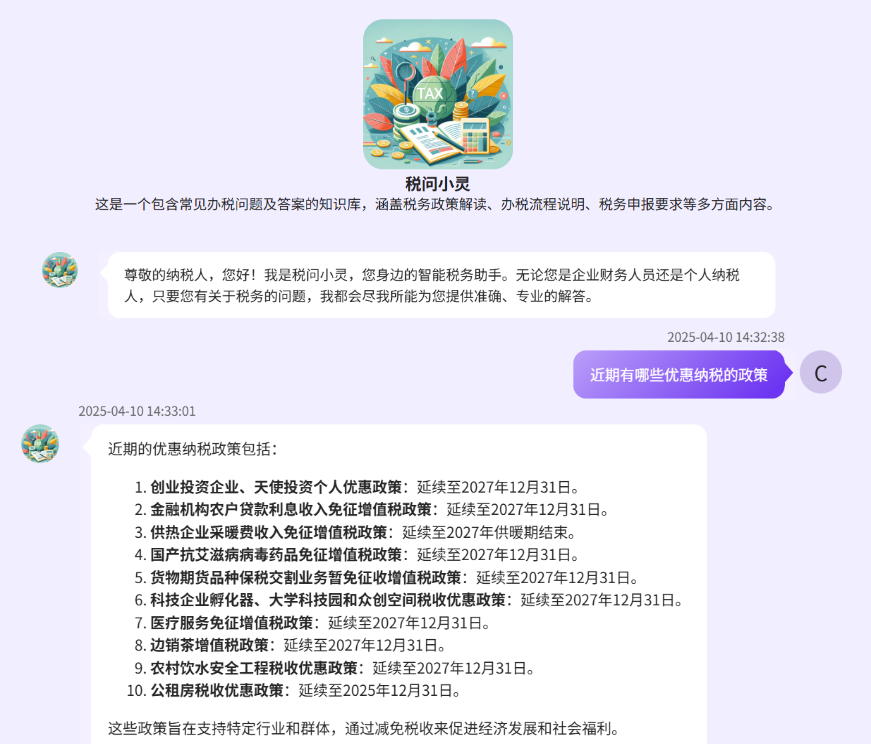 · 办税指导:引导用户进行办税服务,如用户需要办理代开发票,完税证明,单位社保费申报等,则引导用户进行办税指引。