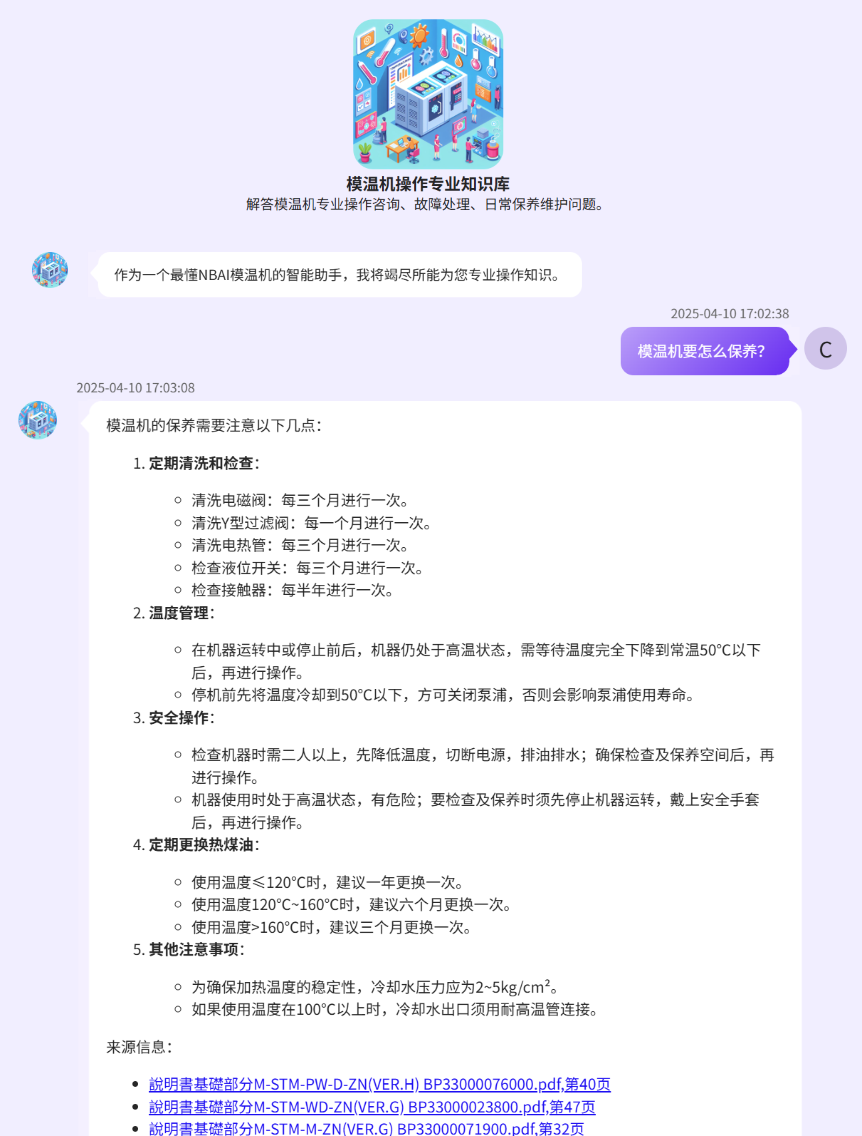 · 专业操作教程:根据制造生产专业设备的操作SOP知识库,返回专业的操作流程给到用户。