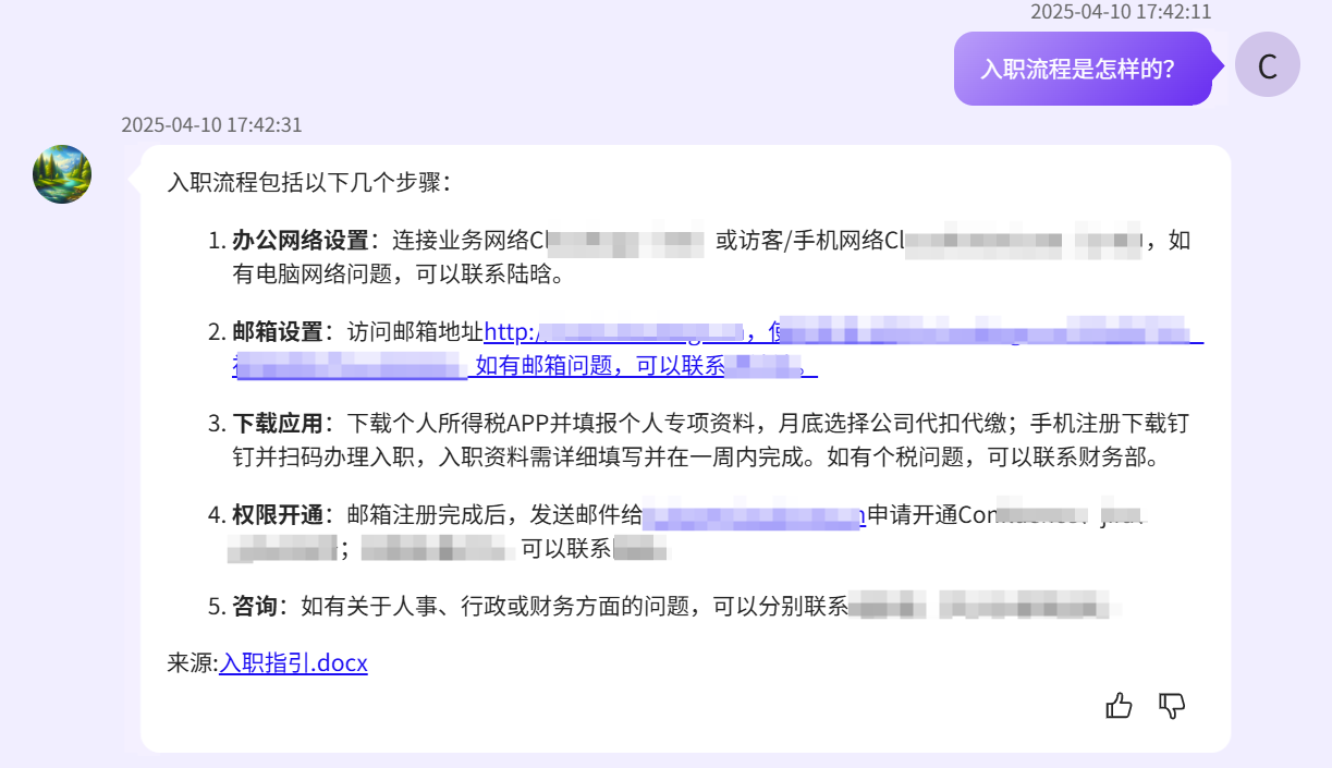 · 入职指引:根据企业新员工入职资料,智能引导新员工办理入职流程。