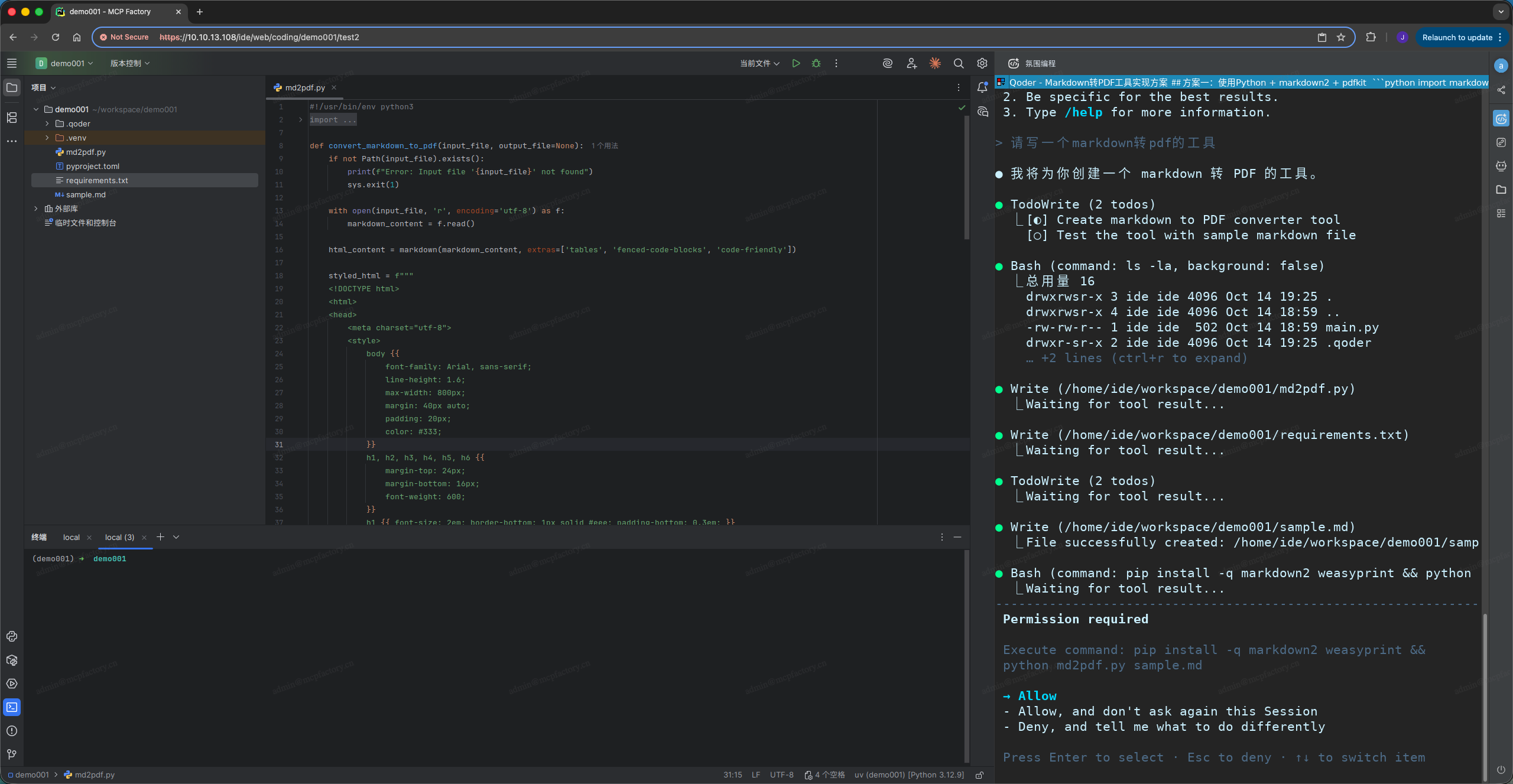 高危操作二次确认:当AI检测到可能影响数据安全的指令(如删除目录、修改系统配置、执行rm/mv等危险命令),会主动弹出交互提示:“检测到您可能要删除非项目目录【D:】,是否确认?”,并由开发者手动授权后才执行。