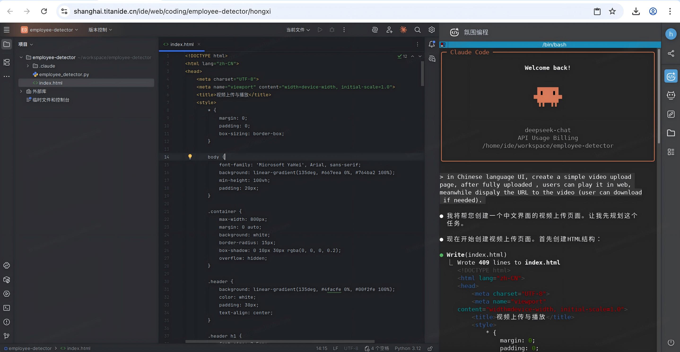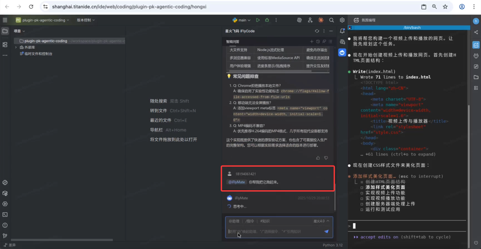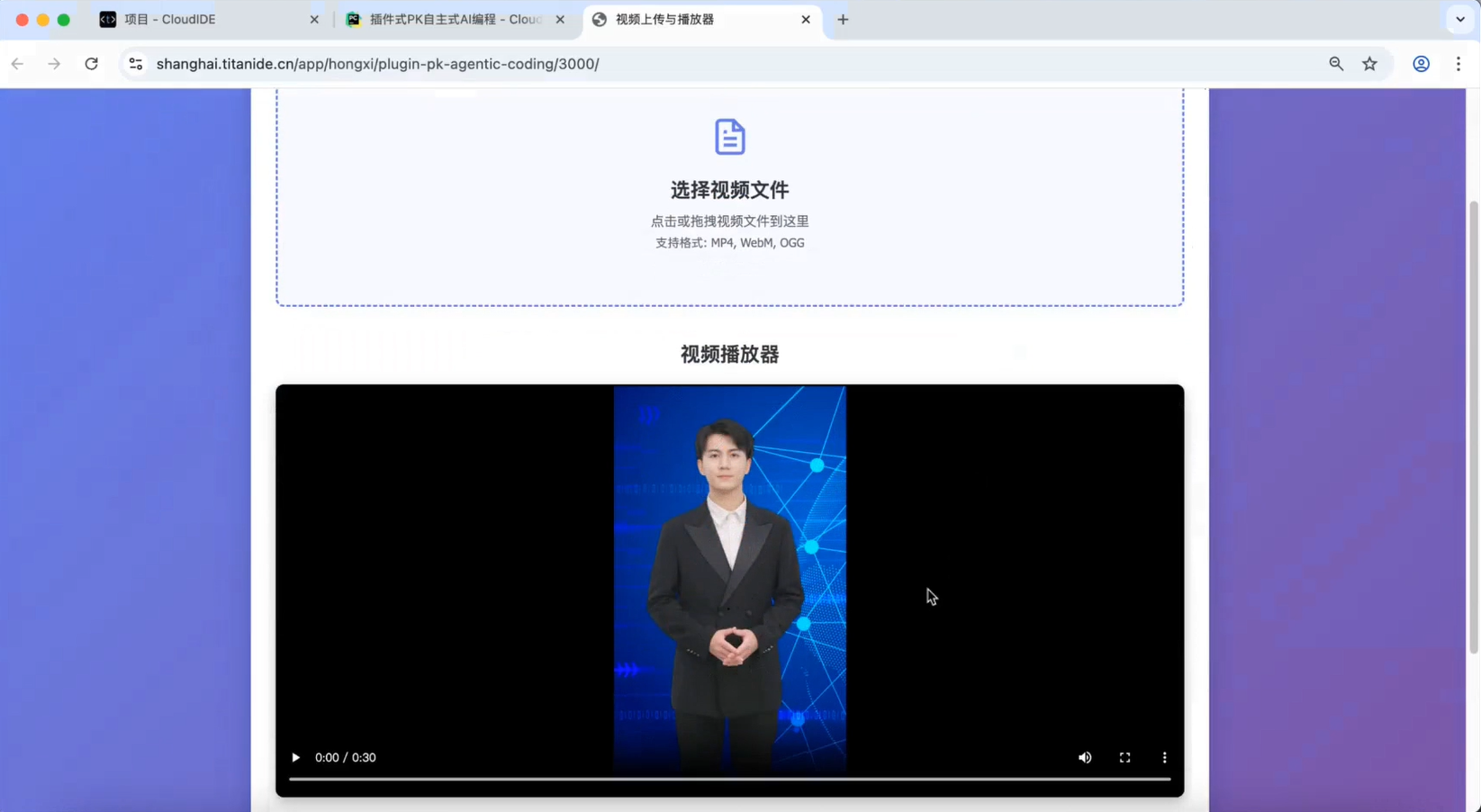 想实现一个 “视频上传、播放” 功能网页,要是按传统开发流程,装环境、写代码、配服务,没半小时下不来 —— 但用 TitanIDE 3.0,全程在浏览器里操作,靠 AI 辅助,几分钟就能搞定,甚至不用污染本地开发环境。