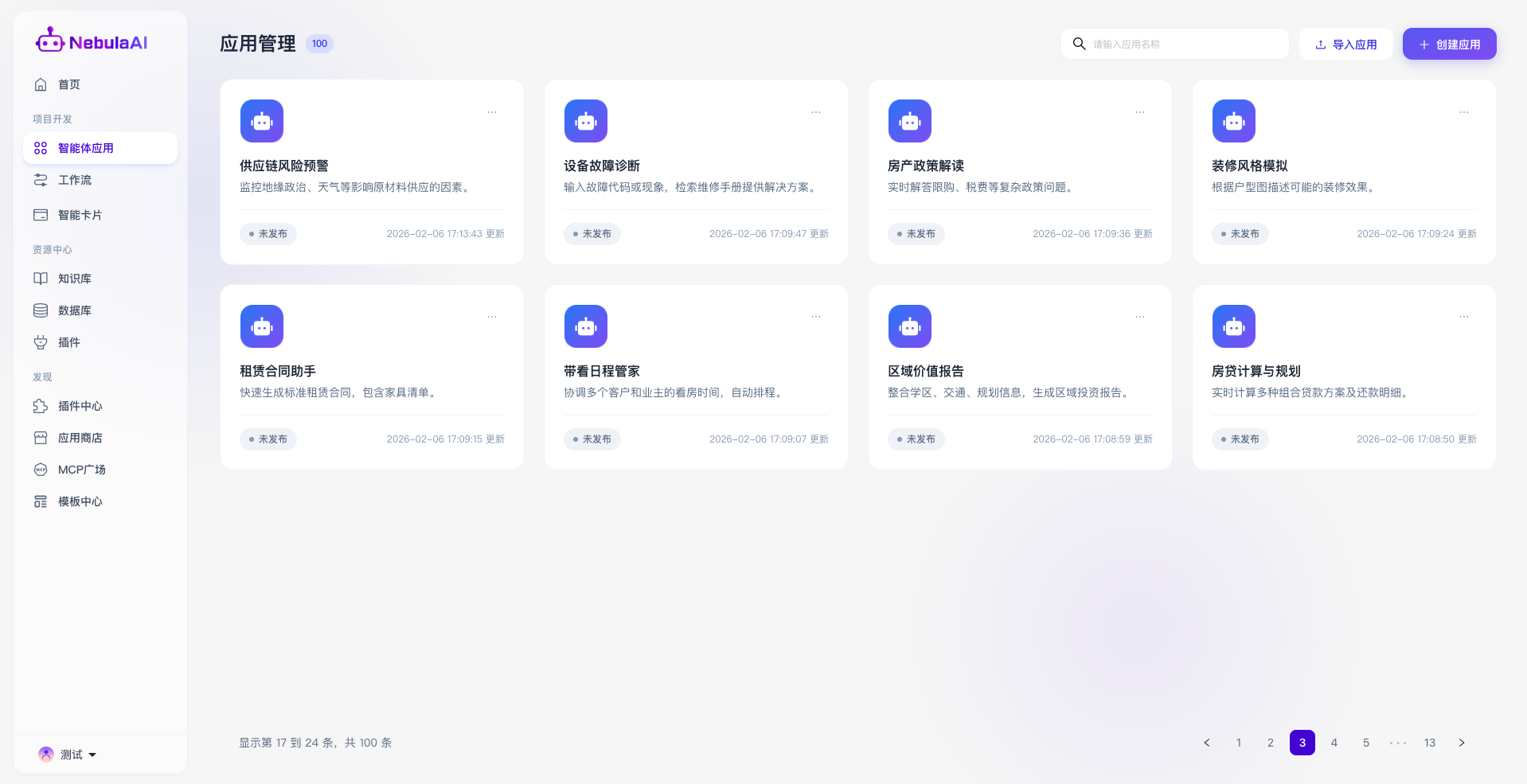 沉浸式视觉重构:平台全面升级至 Nebula Design 3.0 设计语言,采用现代化卡片式布局与清爽的色彩系统(Purple & Light),优化了信息层级展示。左侧导航栏与工作区布局更加符合人体工程学,大幅降低用户在多任务切换时的认知负荷,提供更流畅、舒适的操作体验。