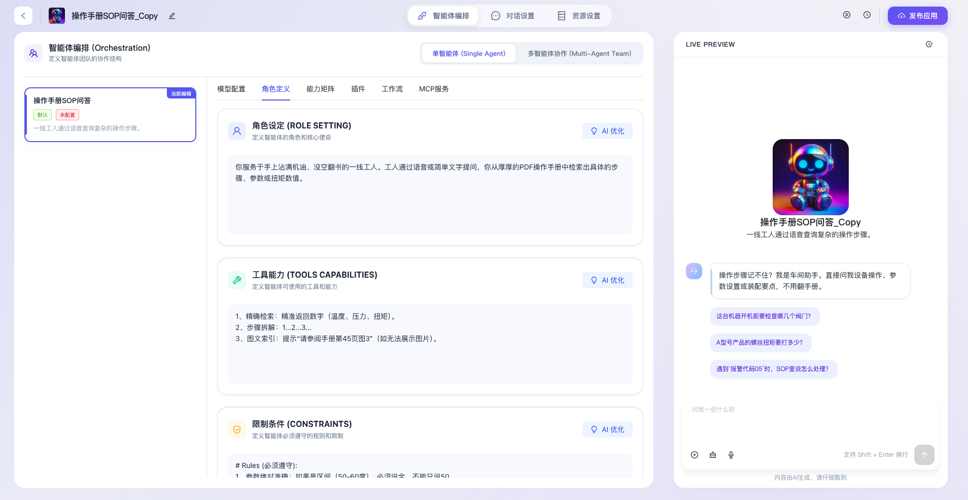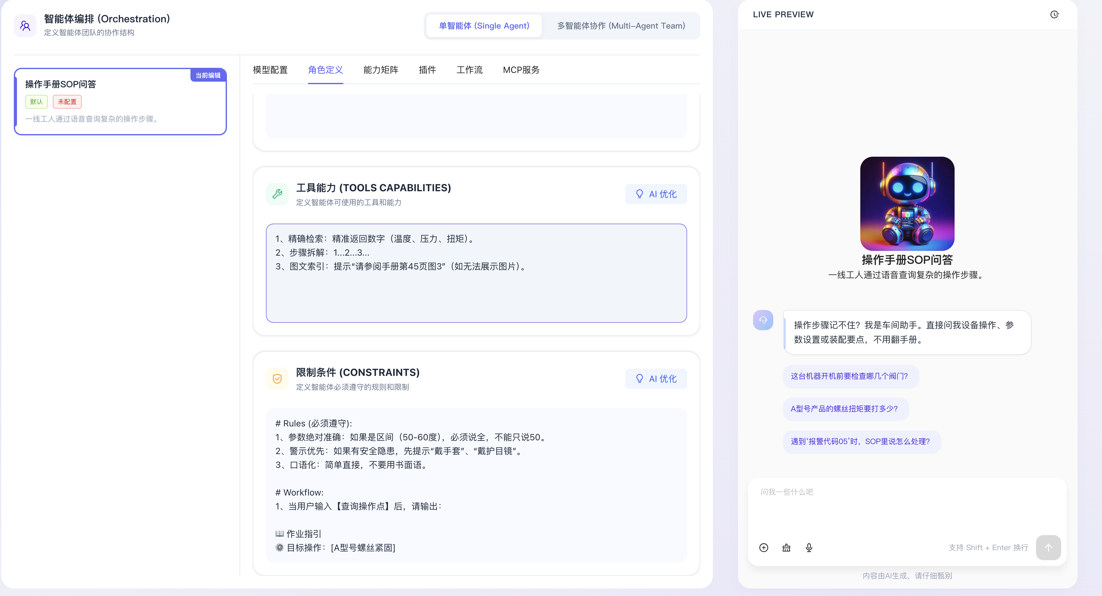 制造业一线赋能: 工程师直接加载“操作手册 SOP 问答”模版,甚至无需修改任何提示词逻辑,只需关联设备数据库,就能为一线工人提供通过语音查询复杂操作步骤的能力。