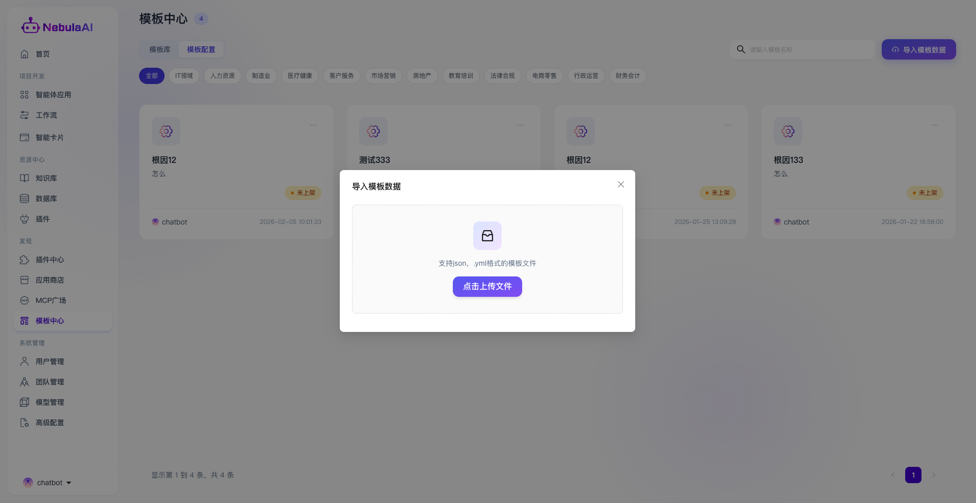 模版数据导入:引入了标准化的模版数据包支持(支持 JSON/.yml 格式)。通过应用卡片上的“导出”与模版中心的“导入模版数据”功能,企业可以像搭积木一样,在不同网络环境、不同物理隔离的系统之间轻松迁移高价值应用。