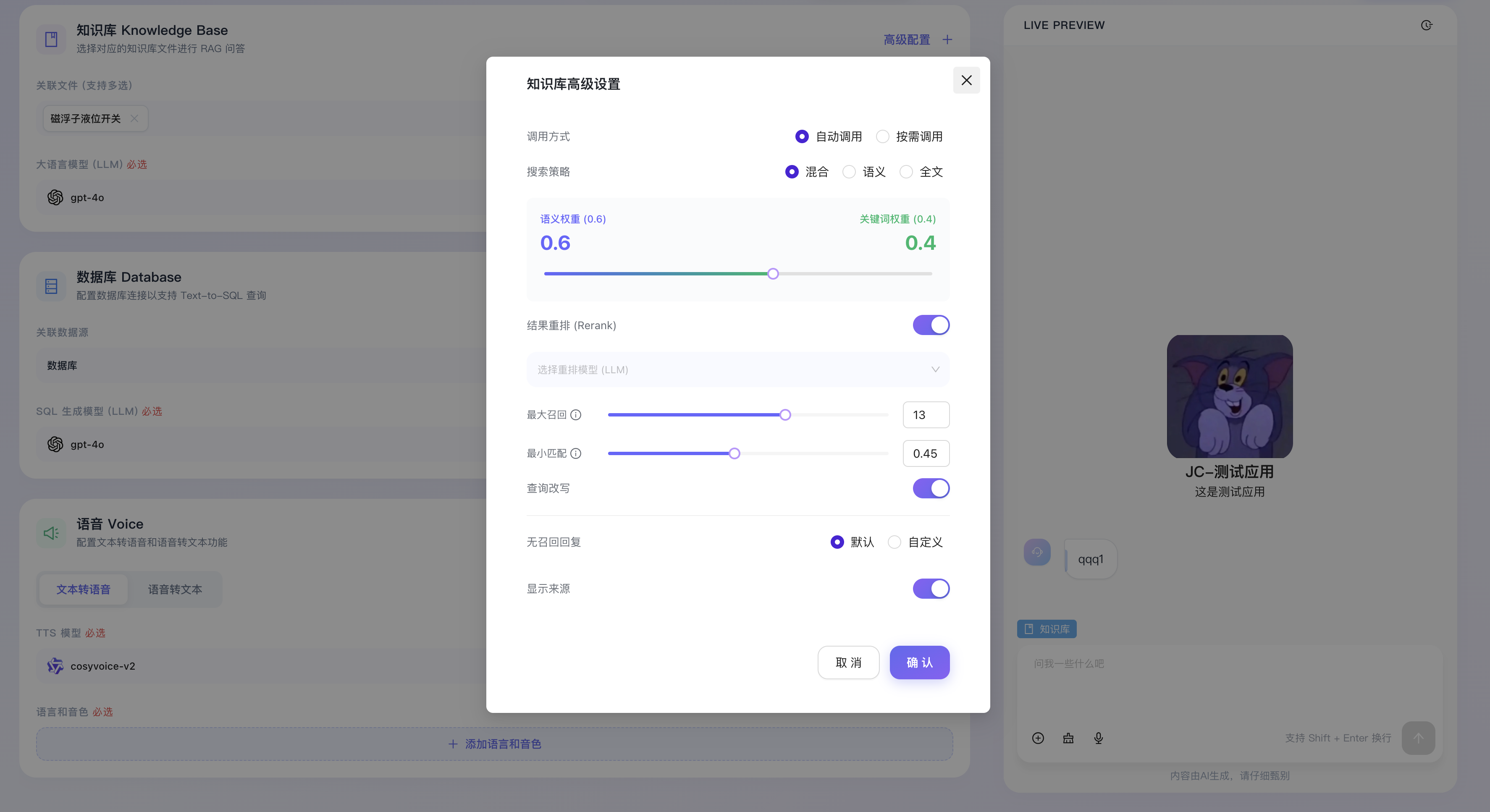 为满足高精度知识问答需求,知识库高级设置页面进行了全面重构,赋予开发者对检索链路的极细颗粒度控制权。