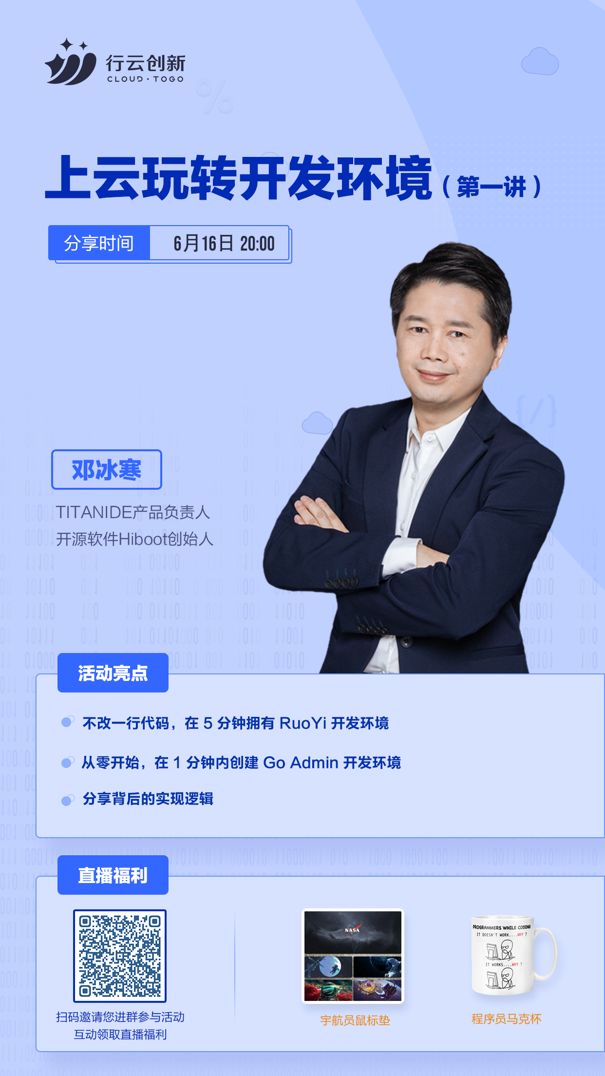 6月16日20:00,“上云玩转开发环境”第一讲即将开启!行云创新 TitanIDE 产品负责人邓冰寒将分享:如何利用 TitanIDE 在不改一行代码情况下,在5分钟拥有 RuoYi 开发环境;如何从零开始,在1分钟内创建 Go Admin 开发环境;以及分享这背后的实现逻辑。直播间还会送出宇航员鼠标垫、程序员马克杯等福利,快扫码参与活动吧~