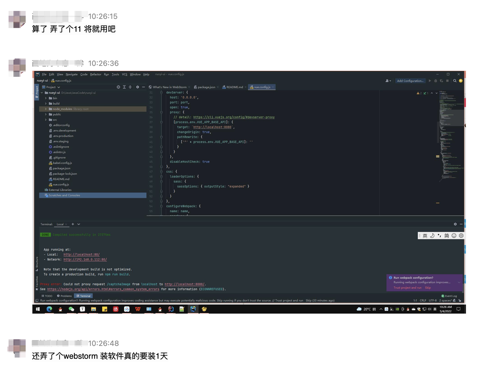 近日有位程序员网友吐槽,为了折腾 RuoYi(若依)的开发环境,耗费了几天时间,光安装 WebStorm 并安装软件就要一整天,到底是什么情况呢?
